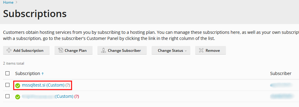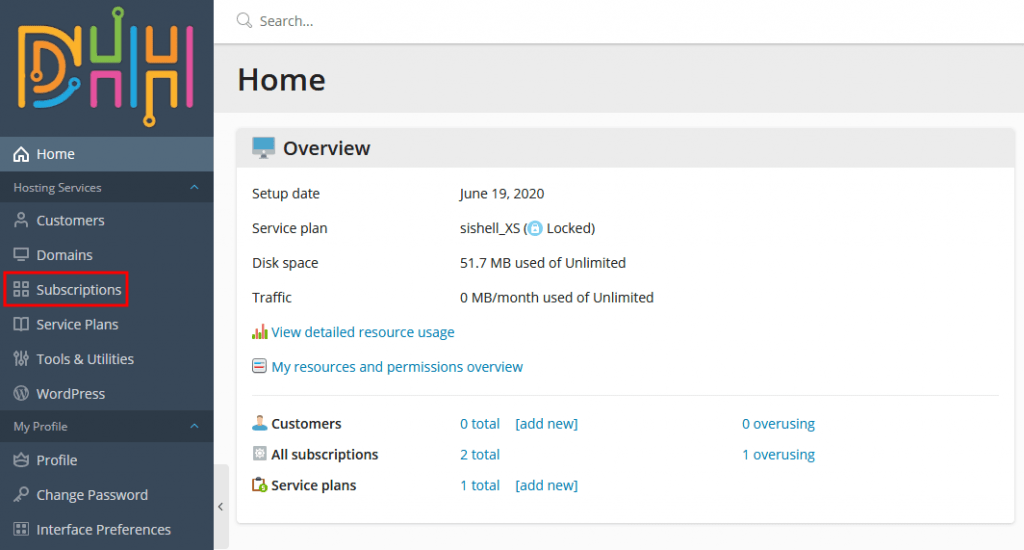 1. V Plesk nadzorni plošči v levem meniju izberite opcijo “Subscriptions“.