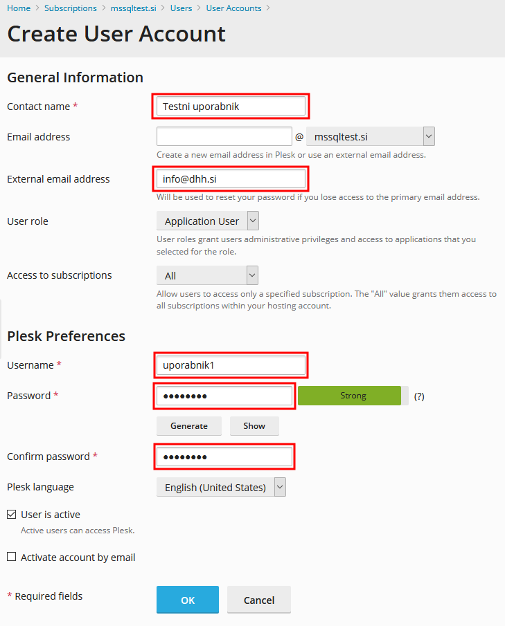 5. Izpolnite obvezna polja (ime uporabnika, e-poštni naslov, uporabniško in geslo) in na koncu kliknite gumb OK.