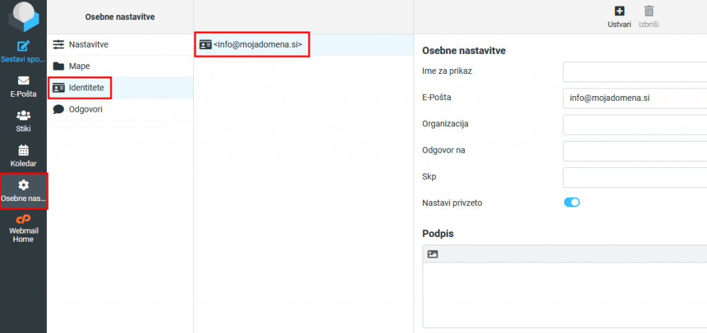 - Prav tako lahko v identitetah urejate tudi podpis, ki bo viden vsem prejemnikom vaše e-pošte.
