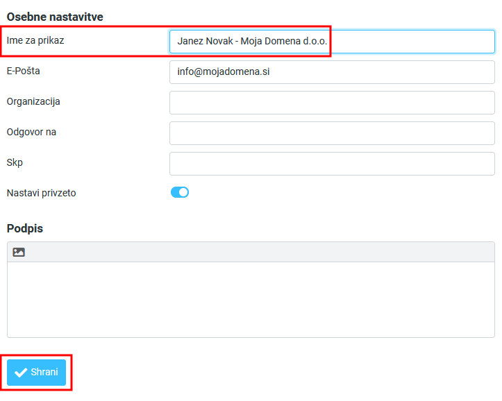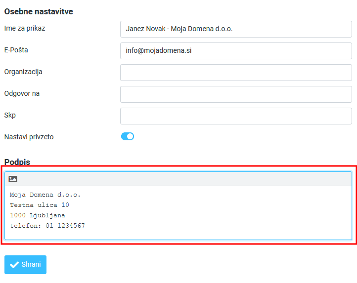 V polje Podpis vnesite besedilo in kliknite shrani.