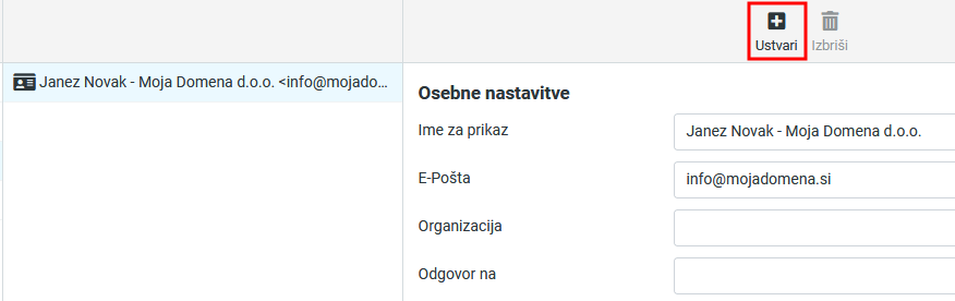 2. Če želite dodati novo identiteto, spodaj kliknite na znak +. Odpre se vam nova identiteta. Vpišite podatke in kliknite Shrani.
