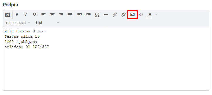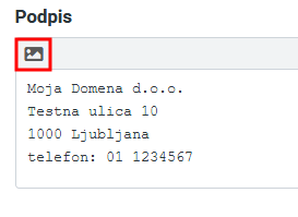 2. Če bi v podpis želeli dodati tudi grafiko, kliknite na ikono “fotografije“* v zgornem delu polja. S tem boste vključili t.i. HTML urejevanik. Pojavil se bo dodatni meni.
